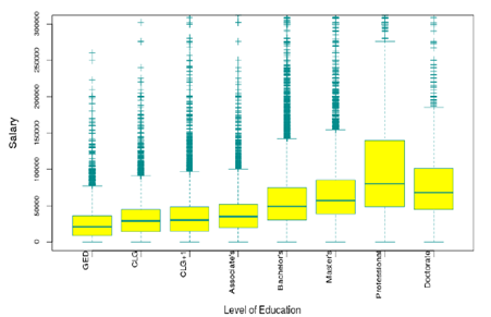 From the above graph, one can infer that which gender involved most in which occupation. Here, one can see that percentage of men in the dales field is more in number than compared to others. Transportation field also contains higher percentage of men next to the Sales. In addition, percentage of women is distributed almost equally in all the occupational fields. Further, in order to achieve the second objective, boxplot technique is used to identify the relationship between the education and salary. This helps in understanding the income growth under different levels of education. Usually, the more educated person will get higher salary. However, from this graph, Professional degree holders are getting more salary than the doctorate degree holders which is quite unusual. Likewise, one can compare the median and quartiles of each field in the boxplot for better understanding of the level of education and annual salary.