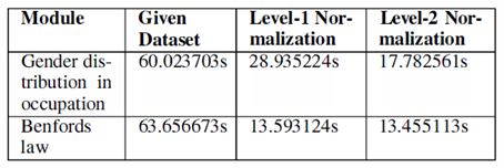 Analysis methods are the useful tool for analysing large dimensional dataset. However, K-means clustering is the most versatile technique for getting valid results. In that sense, in order to achieve the economic hierarchy, k-means clustering technique is adopted for economic income variable, and the distance between each data values and a set of clusters are measured using centroid clustering method and then plotted the cluster against the classes. Even though, the clustering technique is widely used in the literature, the problem of finding the number of clusters still persist. Furthermore, Benford’s law is discussed for plotting the actual versus the theoretical values. Finally, the mean and median of the income across the states is depicted using heat maps. For more information in this regard, refer Sharath et al (2016). In addition, the time complexity of the performance of the analysis gets decreased by including the level of normalization is also discussed and are tabulated below.