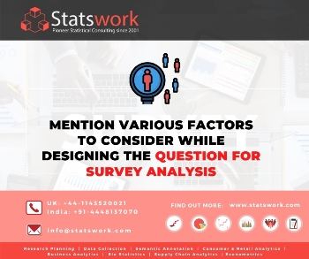Mention various factors to consider while designing the question for survey analysis.