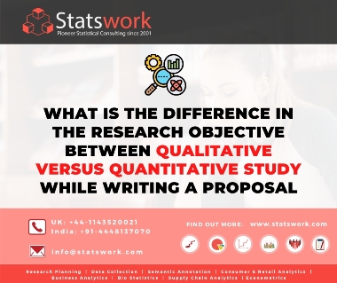 What is the difference in the research objective between Qualitative versus quantitative study while writing a proposal?