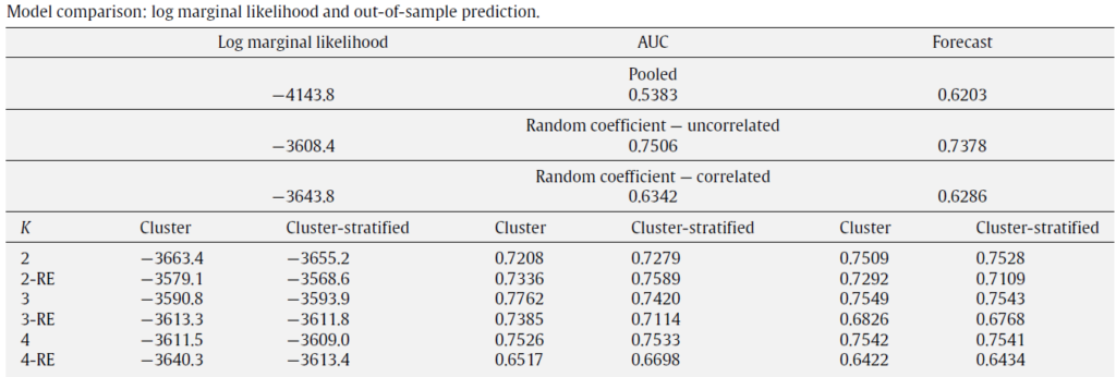 In conclusion, the issue of model selection under the latent heterogeneity is analyzed using the Bayesian probit model via clustering approach and the results of the study revealed that the model selection using marginal likelihood is preferred in Bayesian point of view. Also, the proposed stratified clustering technique yields better performance in different scenarios than compared with classical non-stratified clustering method. The illustrative example revealed that the there exists a strong evidence in capturing the latent clusters using this latent heterogeneity methods. However, the author conclude that in out-of-sample case, the stratified clustering doesn’t give satisfactory results because of the AUC measure and concludes that there is a need for more appropriate methodology to give consistent results in model selection process.