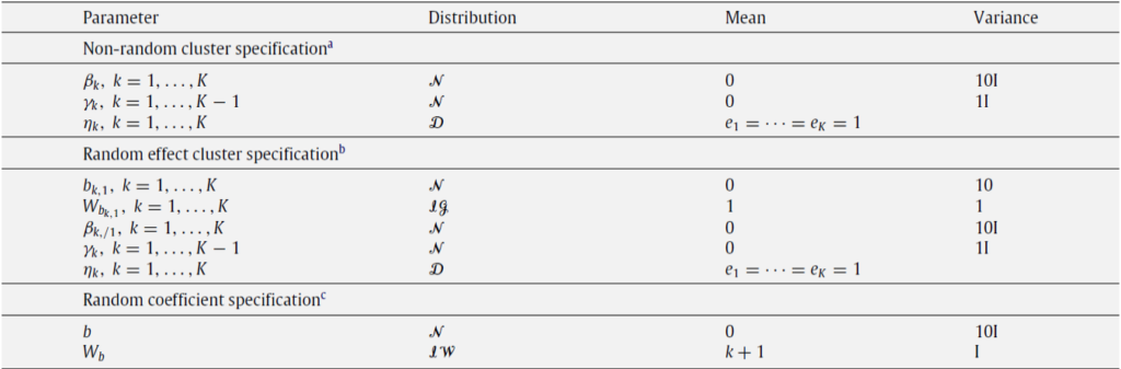 Now lets discuss the key points of the techniques adopted in this paper. Firstly, the priors are chosen with normal and dirichlet distribution for the parameters under study and are presented in the following table. The non-random and random cluster specification priors are used for the simulation and the last part is used for the empirical study.