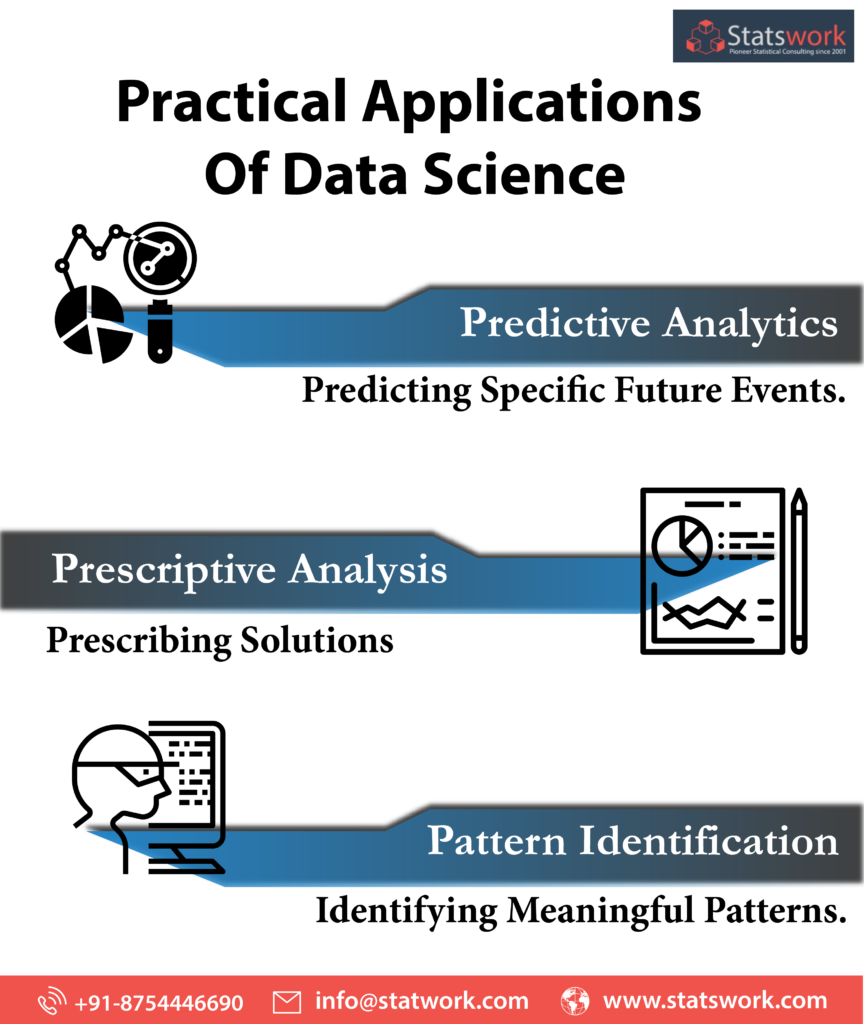 Data science makes it possible to train models to infer from unstructured data. It is mostly used for decision making, restrictive analysis, and predictive casual analysis. Some of the practical applications of data science include,